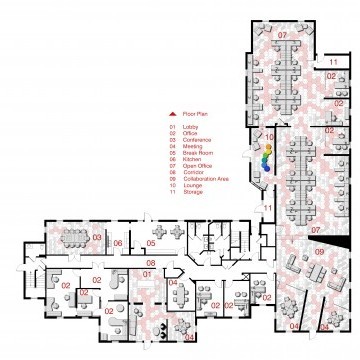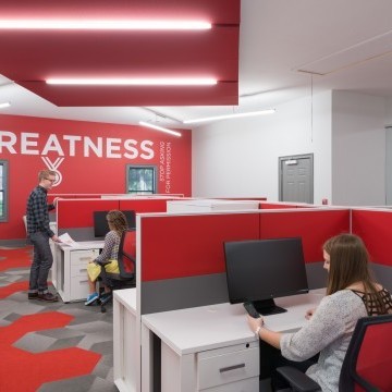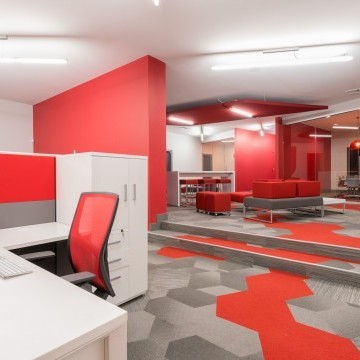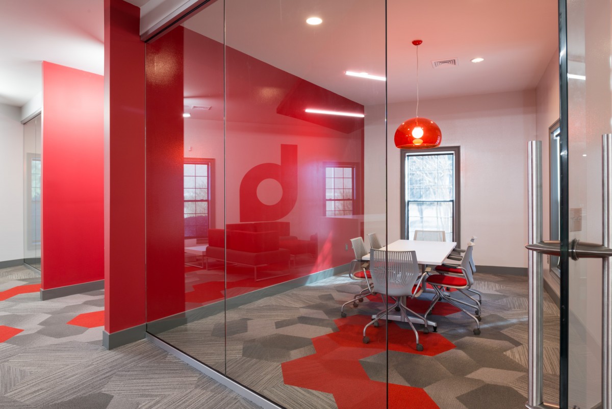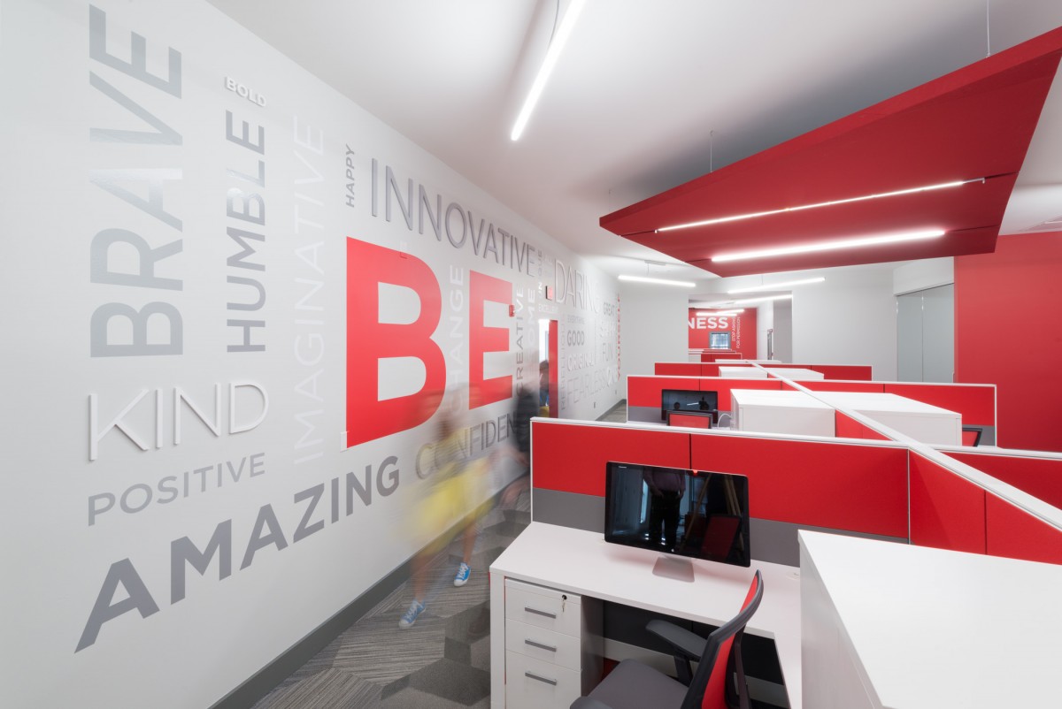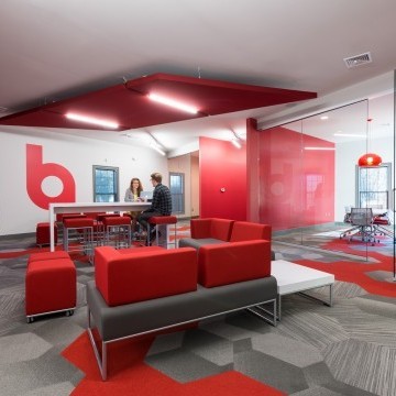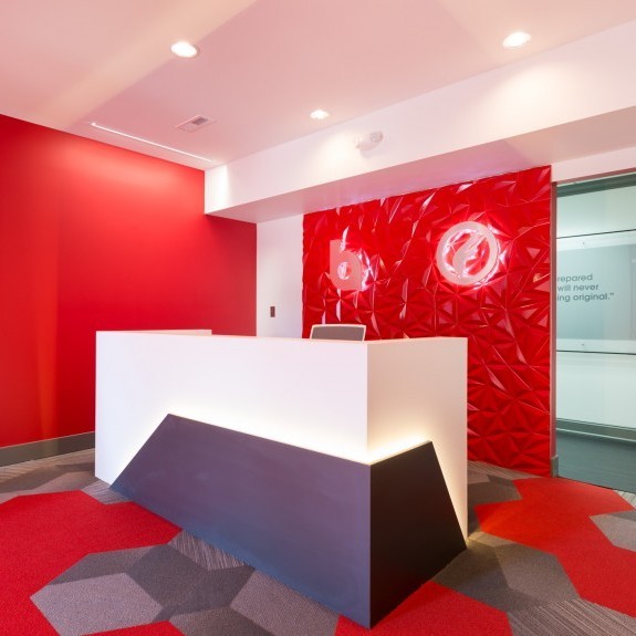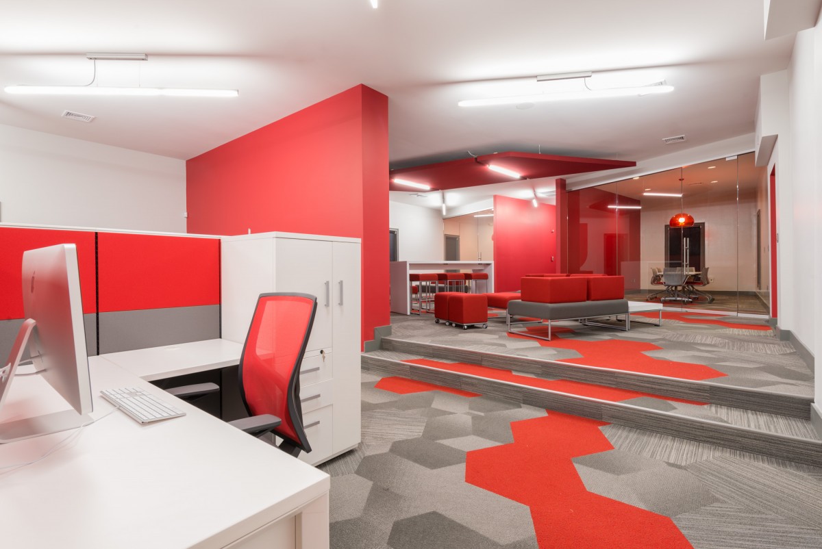The Brandon Agency is an advertising agency located in a traditional building in Myrtle Beach, SC. The existing layout was traditional in style with individual offices, which did not promote collaboration nor did it represent the agency’s portfolio of dynamic work. The overall project goal was provide an inspiring, creative, collaborative workspace that reflected the process and work the agency produces. The solution was to open up all of the existing offices providing an open workspace with support spaces such as meeting rooms, break out creative spaces, and collaborative spaces. The color palette reflects the branding of the Brandon Agency, while the geometry of the materials and architectural elements in the space reflect the edgy, forward thinking of the agency. The resulting space is one that completely deviates from its traditional exterior skin, but personifies the evolution of the agency’s work processes and products they deliver.